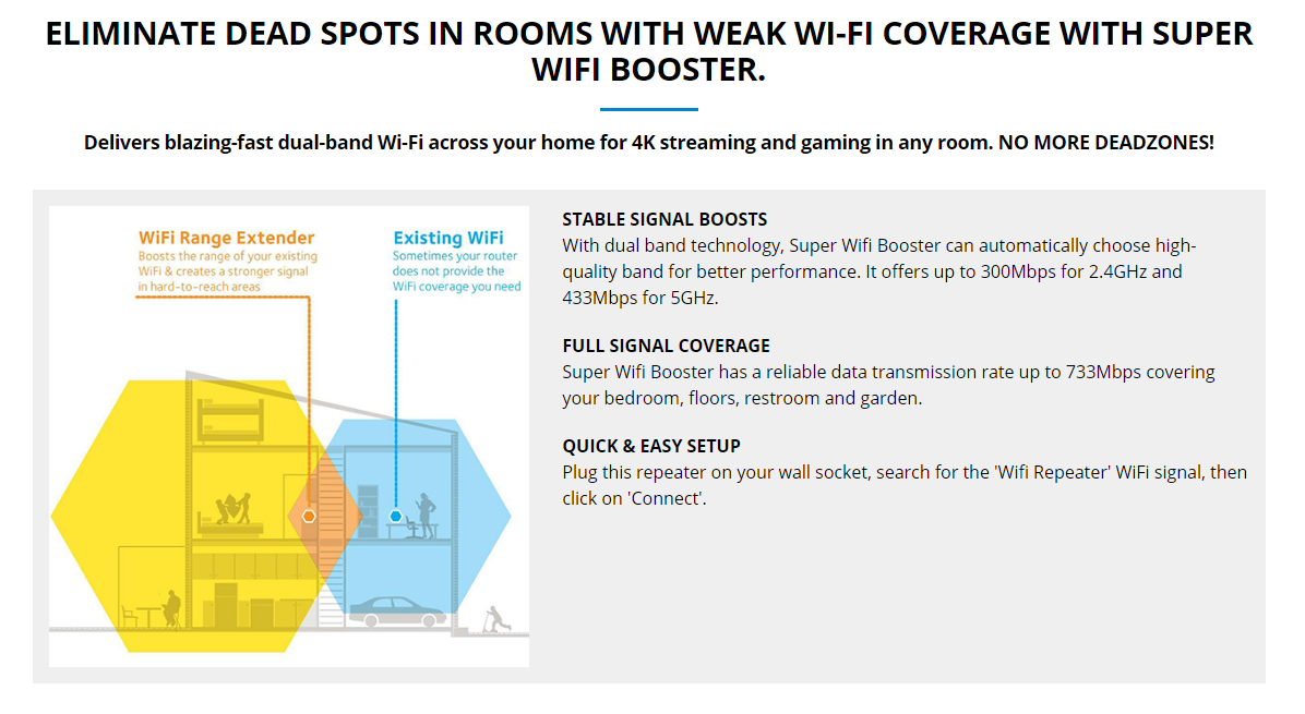 It works as a Wi-Fi signal booster by extending your wireless router signal and turns your entire house into a Wi-Fi hotspot.